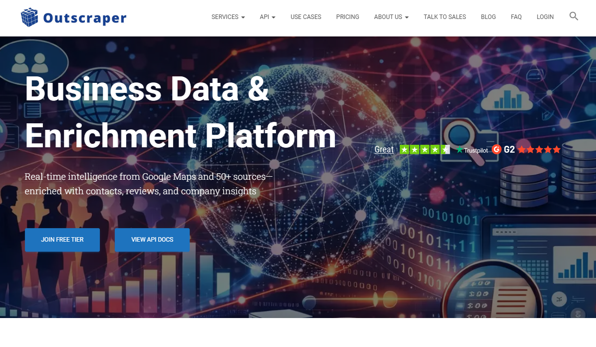 Outscraper (outscraper.com) positions itself as a "business data and enrichment platform." It pulls from Google Maps plus 50+ other data sources, enriches records with emails and social profiles, and gives API access to developers who want custom pipelines.
